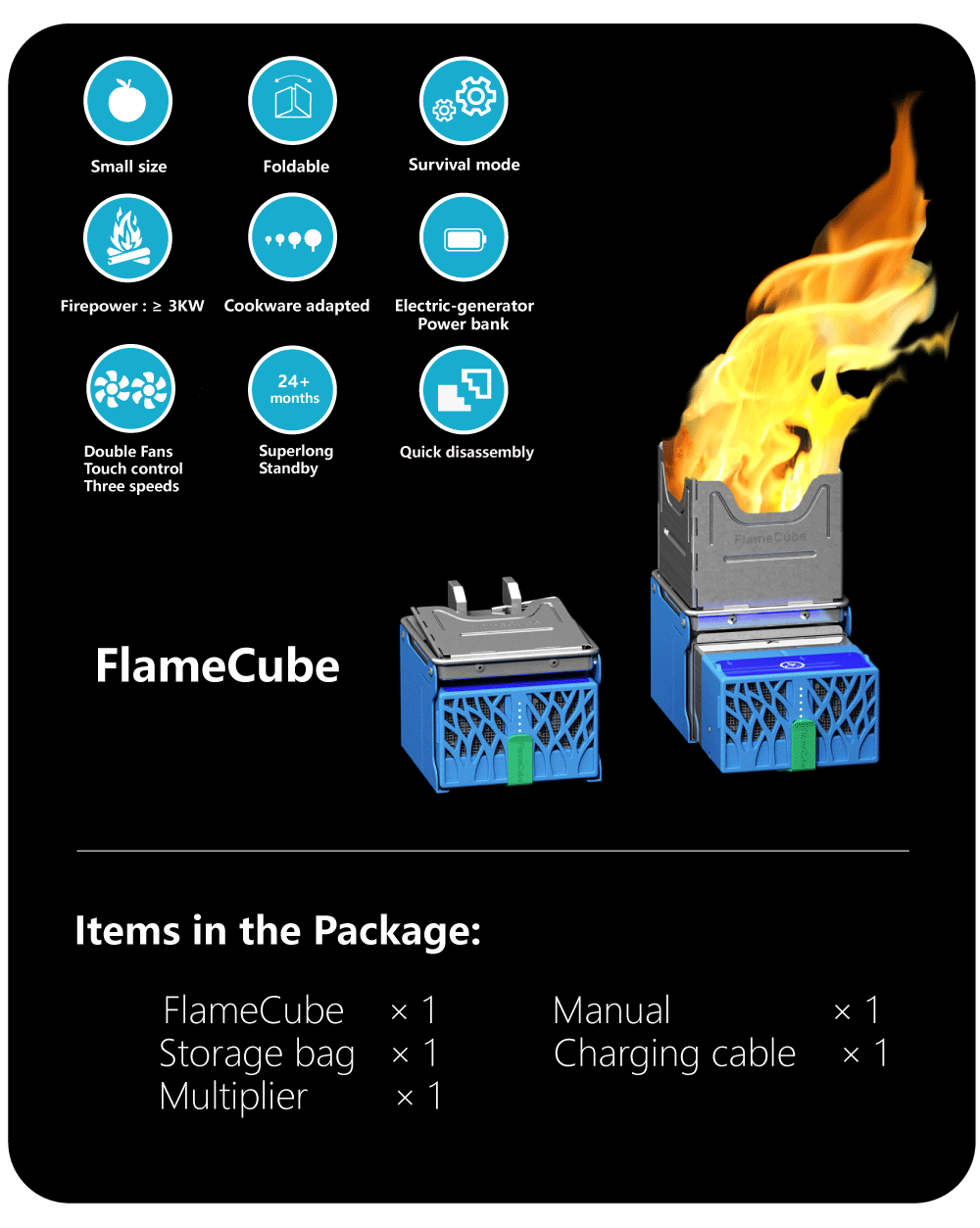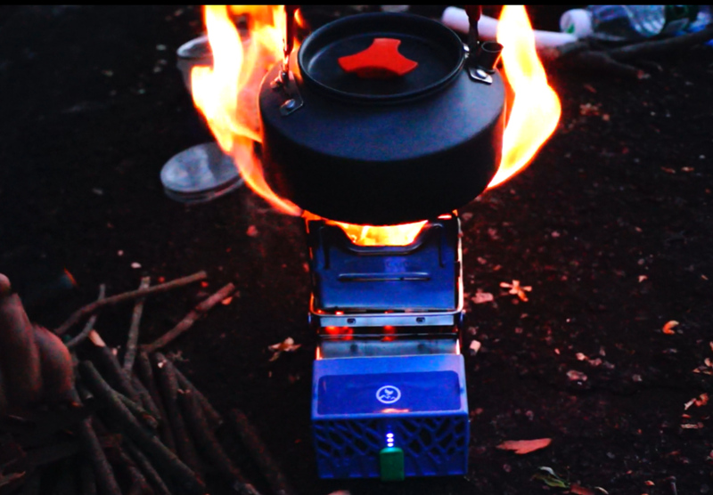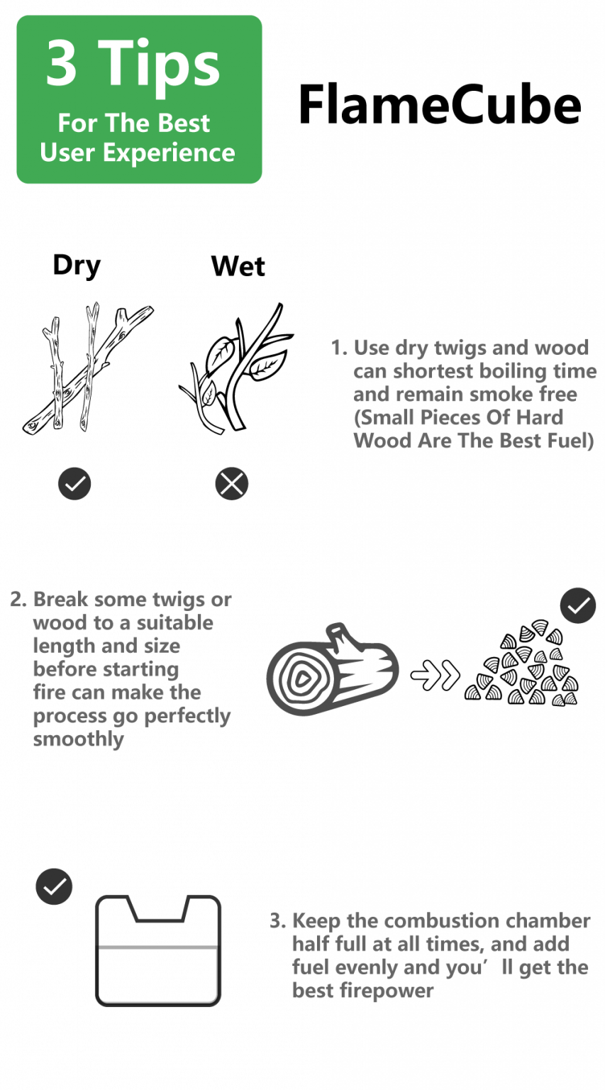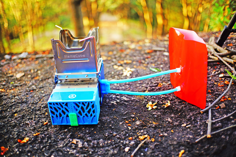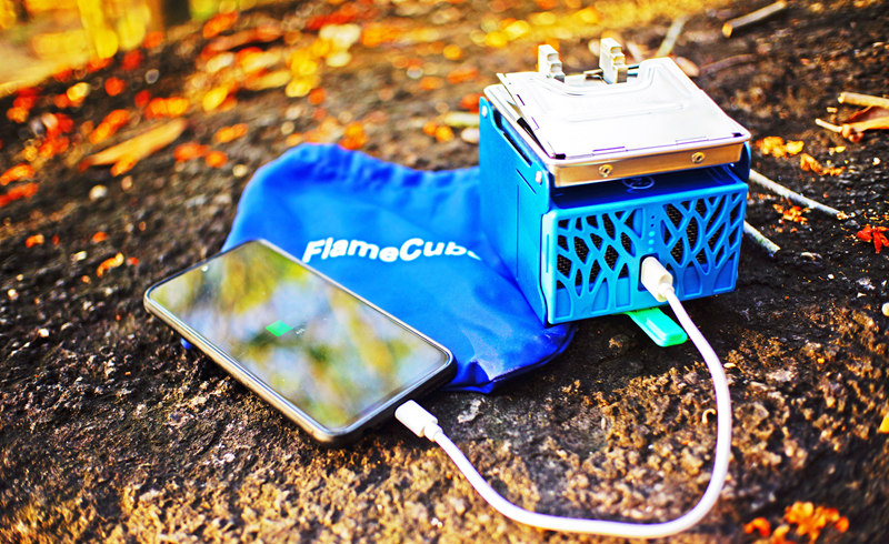 Using twigs, pine cones or other biomass fuel to build a fire. With fire, the thermoelectric generators inside of the FlameCube can turn heat into electricity! Then use a portion of the electricity to power fans , pumping in more fresh air to help the fire burn cleaner and hotter. While most of the electricity to charge phone or stored in a built-in lithium-ion battery of FlameCube.